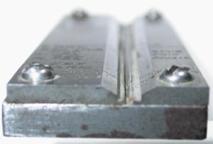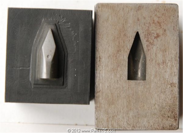 Here is a nib die for taking the imprinted and tipped flat nib to one with the characteristic curvature of the 75 nib see in step 3 above.