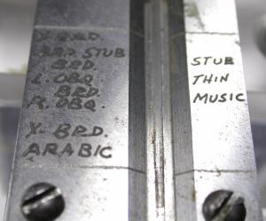 Stub thin music. A flat nib thinner than the fine stub nib that was intended for sheet music writers. It permits the user to write small musical notes. |