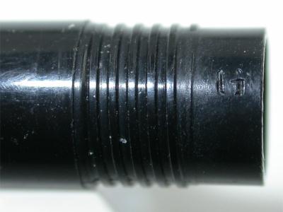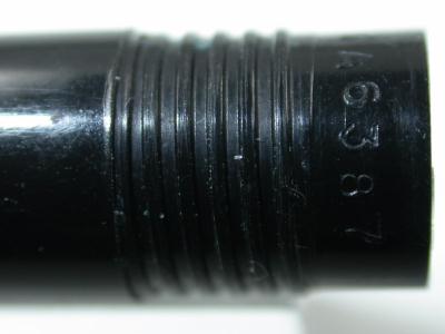 Early production used sections with metal threads as shown below. These can be readily seen even when the section was fitted onto the barrel because the metal threaded left a visible telltale band on the barrel.